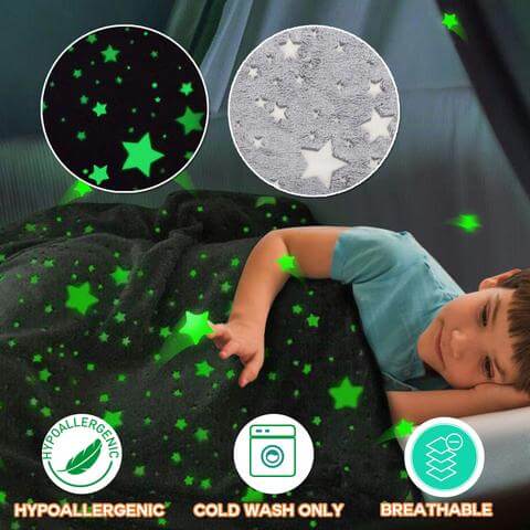 BLANKGLOW! Изработено од светлечки материјали, ова магично ќебе го прави сонот космички! Светлечките материјали испуштаат релаксирачка зелена светлина ноќе!