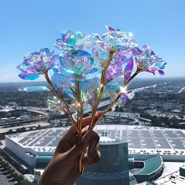 Секоја роза е изработена со иридесцентен и холографски премаз кој прекрасно свети на светлина, создавајќи сјај сличен на галаксија кој е едноставно хипнотички.