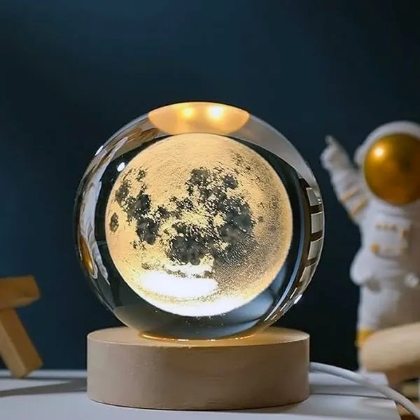 Изработена од висококвалитетни материјали, вклучувајќи масивно дрво и кристал, оваа ноќна светилка има компактни димензии, со пакување од приближно 8 x 7,5 x 9 cm и кристална сфера од околу 6 cm, за извонредно ноќно осветлување. Исто така се испорачува со приложен USB кабел.